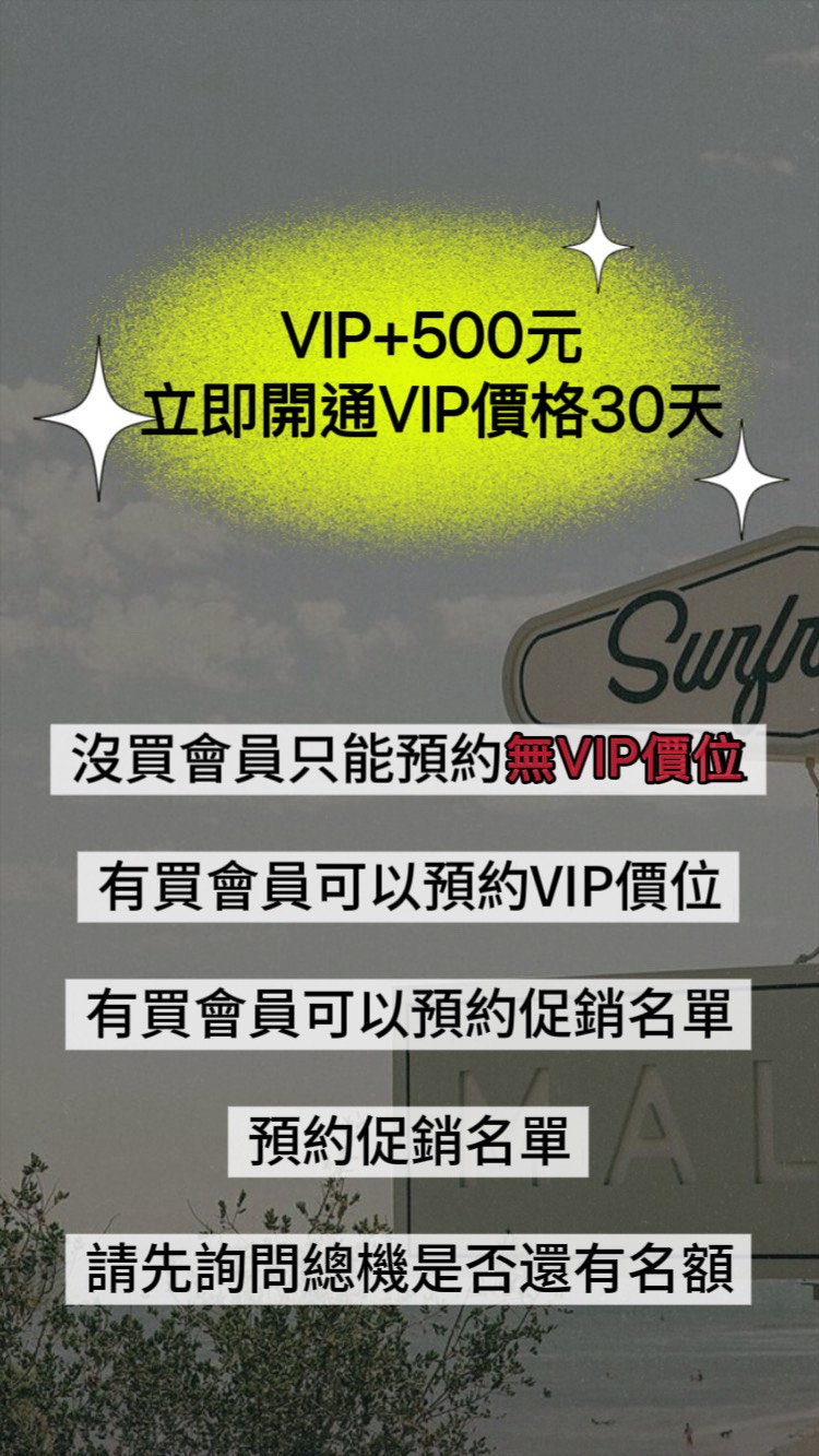 申購穩賺不賠VIP會員~只要$500!!! 可以立即使用!!! 每次消費都能享有VIP會員價!!! (等同於消費每次折抵價值$200~400) 會員期間內不限使用次數 (卡片期限30天) 如要購買,預約時請先告知總機哦~ VIP會員福利: 可以預約網頁上的VIP促銷區